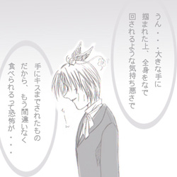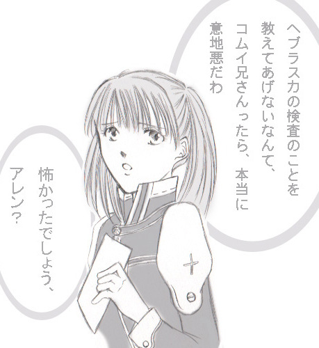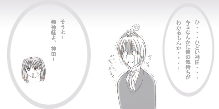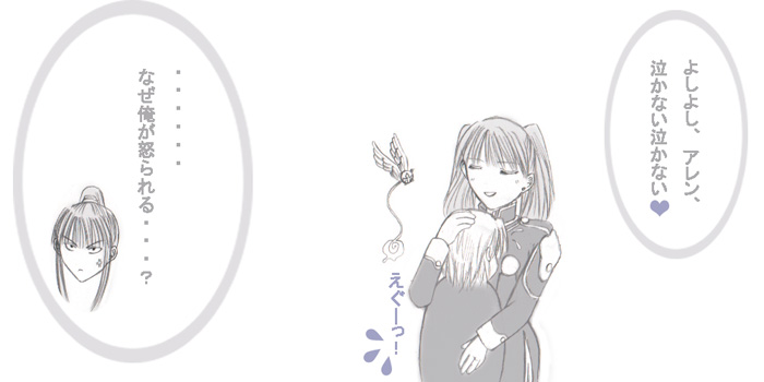 D.Gray−manまんが第3弾。 今回、一番力が入ったのはリナリーなのに、思いっきり団服を描き間違えていたり・・・。 (ローズクロスはまだ原画を作っていないので、付けておりませぬ・・・>手抜き;) そして、相変わらず神田がうまくかけません;; 文字色は、縮小することを考えて、もう少し濃い目にしようと反省・・・; |
