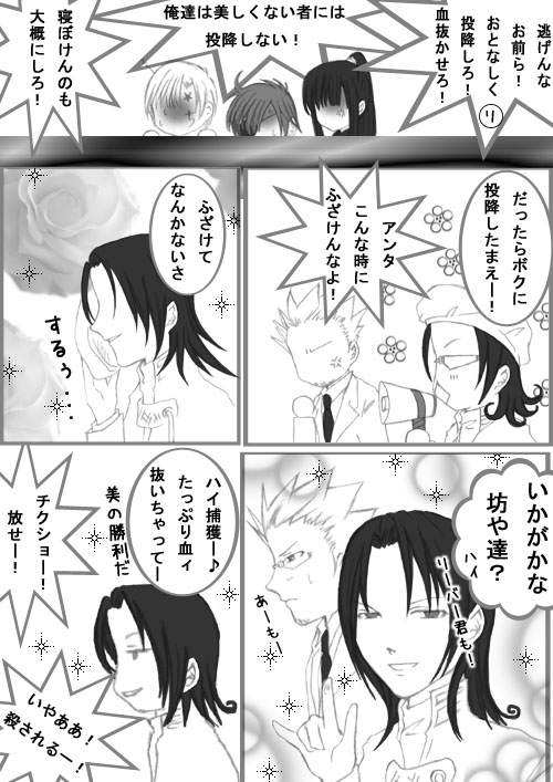 コムイさんお誕生会開催中なのに、あんまりお誕生会にはちなんでいない漫画(笑) 実はこれ、D.グレを知った当初に思いついたネタだったので、もう何年も寝かせてました(笑) 元ネタはパタリロ・・・(ゴメン) おそらく、知ってる人が少ないんじゃないかと(笑) ティーンズは『こう言えば逃れられるはず!』って魂胆だったんですが、相手が悪かったですね(笑) これ描いてる時、薄桜鬼見てたんで、メガネ取ったコムイさんがなんか土方さんチックですみません; |