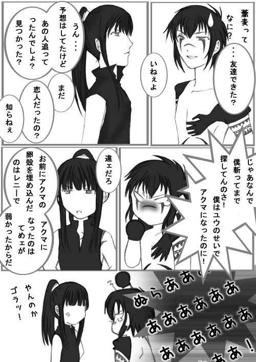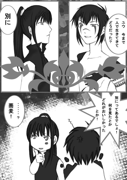 早く描かなかったためにやや腐ったネタ(笑) 考えたのは実は、まだユウちゃんが夢の中にいた頃です(笑) どんだけほっといたんだよ、って言われそうですが、仕方ないじゃん、アルマ描けなかったんだから(笑) 35萬HIT記念絵でかいんさんに『描け』って言われなきゃ、きっとずっと描きませんでした(笑) だって私、絵描きじゃないもん(笑) 黒髪二人のせいで、めちゃくちゃ腕疲れたよ(^^;) でも続きます★ |