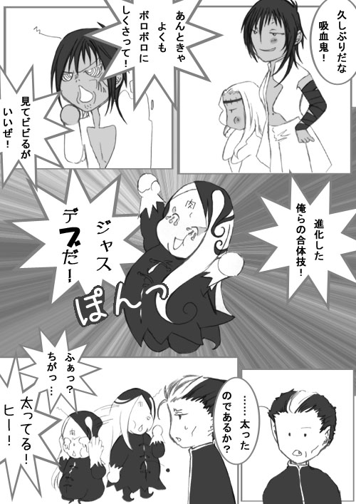 4日の発売日前にどうしても描きたかったネタ(笑) ネタ自体は、結構前に考えていたんですけどね(笑) 本当にこんな進化してたら大笑いだよ、ジャスデビ(笑) そしてクロちゃんを『現在』の通りそのまま描いてみたら、なんかフツーのおっさんぽくなってしまいました;;;すみません;;; 更にクロちゃんお誕生会最終日の23時45分に転送完了とか、マジすいません;;; 塗りながら寝落ちしそうになってました; |