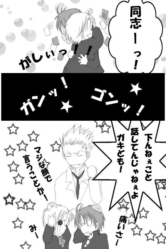 | 男の子らしい話題で盛り上がる二人と、さり気にジェラシーなリーバー班長(笑) 『アレン君はこんなこと言わないもん!!』と、泣かれそうで不安ですが・・・泣く前に、D.グレ4巻の『談話室Vol.5』を読み返して欲しいなぁと思います(笑) アレン君は『巻き戻りの街』で、ラビは海に身投げしたミランダを助けた時に、それぞれ彼女に触ってますが、班長は未だゆびいっぽん触れていなければいいと思います(笑) ガキどもに先越されて、悔しがってればいいと思います(笑) |