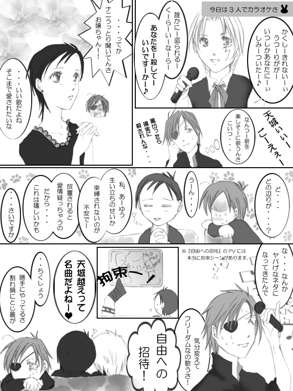 | 星野様が1ヶ月間休載されてしまうため、寂しいファンの皆さんを微力ながら救済しようと思い立ちました★ 名づけて、『休載救済漫画』(なんじゃそりゃ) リナリーって、過去だけでなく扉絵などでも、やたら束縛されてるなぁ、と思って描いてみましたが・・・しょっぱなからやばいネタになってごめんなさい; 神田さんがいないのは、『誘ったけど断られたから』です。 演歌もあるって知ってれば来たろうに、神田さん。(そんなわけあるか) そもそも、19世紀にカラオケがあるか、なんて突っ込みは受け付けませんよ(笑) |