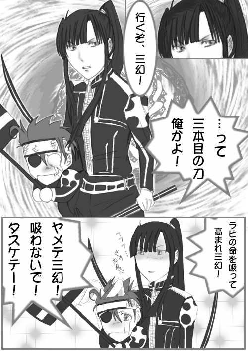 このネタは、ワンピースの水の都編(正式名称知らず;)で、ゾロがウソップを3本目の剣にしているシーンを見て、『もしも神田さんがゾロだったら』と、ネタ帖に書いていたものです。