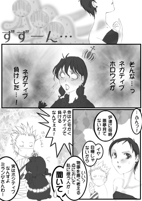 休載救済漫画第4弾★ 救済漫画としては最後の漫画なので、2Pに亘って描いて見ました! このネタは、ワンピースのペローナ嬢の話を読んで大笑いした挙句、(確か)酒飲みながら 『D.グレでやるとしたら、一番ネガティブなのは誰か』 と言う話になったんですよ。 ミランダさんは意外とポジティブなので、最強ネガティブはリナリーに決定です(笑)>男子共も中々にポジティブですからね。 結局は、ラブラブなリバミラ描いただけって気がする・・・(苦笑)>クマシー班長は描いてて楽しかったです(笑) あと・・・『なんでリナこの格好なんさ!』っつーのは、『団服脱いでた』っつー状況をすっかり忘れて今現在の服装を描いちゃったからさ!!(号泣) そうだよね、危機的状況でもない限り、こんな破廉恥な格好でうろつかないよね、姫は;;;←鳥頭 |