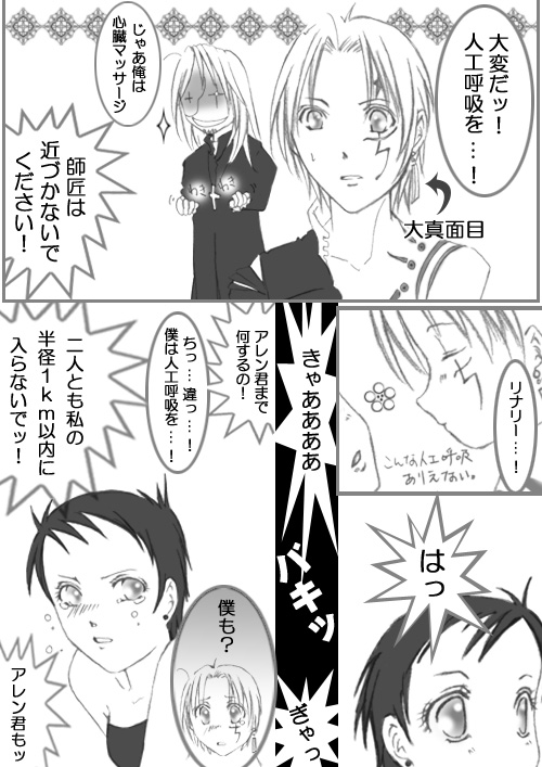 | 第132夜で、リナリーに密着しすぎな師匠と、師匠の毒牙にさらされたリナリーに大慌てのアレン君を読んだ直後に思いついたネタです★ 思いついた時点より、随分とアダルティなシチュは削除したはずなのに、なんだかまだ、師匠の言動がやらしいですね! まぁ、師匠は存在自体がやらしいから仕方ないですね!(をい) 師匠のやらしい影響下に入って、アレン君もやらしい!(こら;) それにしても、相変わらずごちゃごちゃと見難くてすみません; |
