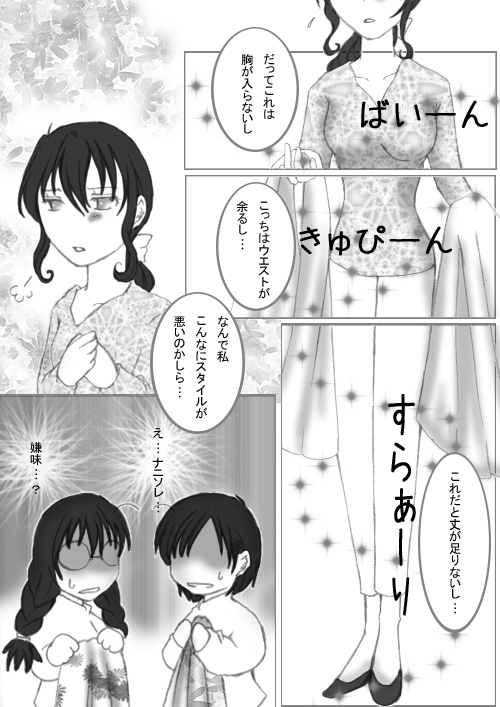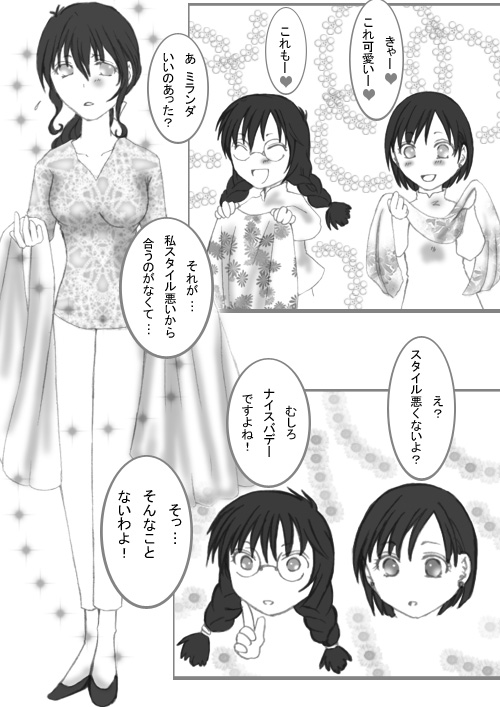 随分遅れましたが、休載救済漫画でございます ミランダさんは、自分がどれだけ可愛いかわかってない!わかってないのがもどかしい!!と思って考えたネタでした(笑) リナリーも蝋花ちゃんも、スタイルはいいんですよ。 もちろん、いいですとも。 だけど、ミランダさん(西洋人)にはやっぱり、胸や腰の細さ、脚の長さでは及ばないと思うのです。>だからと言って、二人が可愛いことには違いないが。 単に、三人仲良くお買い物でもすればいいやと思ったネタでもあります(笑) |