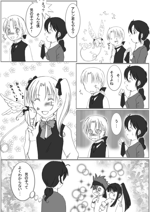アレン君はリナリーのツインテールに憧れてたのか、ティムとおそろいが嬉しいのか、実は描いた本人もよくわかんないと言う(笑)