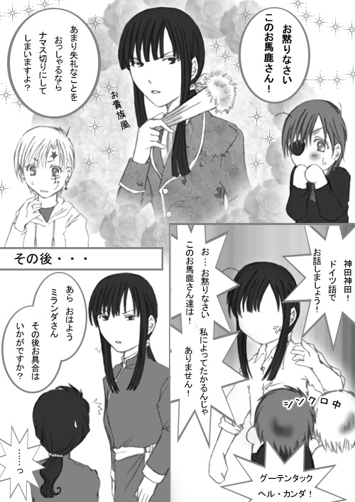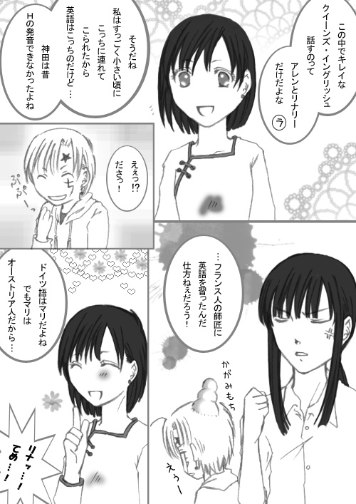 星野様長期休載のため、早期ご復活を願って休載救済漫画でございます 神田さんはドイツのおばあさん相手にもパリの警部相手にも不自由なくお話してたんで、英語日本語あわせて4ヶ国語いけそうだと思います。>反論覚悟。 そしてティエ様に英語教わったんならフランス語なまりだろうな、と予想です。 フランス語は『H』を発音しないそうですよ。>だから『Hermes』が『エルメス』になる。 そしてドイツ語教わったのがマリさんなら、オーストリアのはんなりドイツ語かと(笑) オーストリアはドイツ語圏なんですが、本当はごっついドイツ語がとてもはんなりするそうです。 神田さんのアリエナイ口調はヘタリアのオーストリアさんのパロです(笑) |