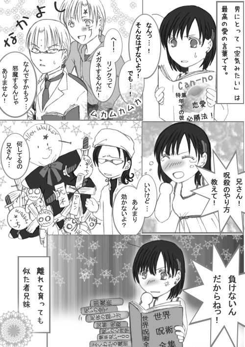 星野様長期休載のため、早期ご復活を願って休載救済漫画でございます コムイさんお誕生会にちなんで、と思ってたのに、コムイさんは一コマしか出て来ない罠(笑) 元ネタは、ネットで読んだ記事です。 なんでも、 「空気みたいっていうと女の人は怒るけど、空気って目には見えないけど、生きていく上でいちばん必要なものでしょう。男にとっては最高の愛の言葉ですよ」 だそうで、これを読んだ瞬間、アレン君の『リンクは空気』発言がプレイバック! ジェラシー=呪殺に走るリナリーはやっぱり、兄さんの妹です★ ちなみに、入りきれなかったんですが、『よくわかる魔術』の本の下には、『殺したい時に読む本』『呪い代行社100』があります。>なにそのラインナップ。 |