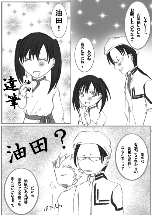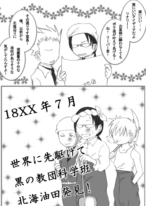 星野様長期休載のため、早期ご復活を願って休載救済漫画でございます ちなみに北海油田は北海にある海底油田。1960年に発見された、比較的新しい油田です。 イギリス他、周辺諸国のもので、欧州にあります。 兄さん達はきっと、ひそかに採掘してたんですよ(笑) で、1960年に教団が権利譲渡したの(笑) なんつって(笑) そもそもスコップとつるはしで油田掘れねェから!(爆笑) 実はこのネタ、七夕用にってニコさんから頂きました。 七夕に油田をお願いするリナリーだそうです(笑) 油田があれば皆金銭的に楽になるんじゃないかと言う願いだったんですが、私、このコメント頂いた時に『油田(ゆでん)』を『神田(かんだ)』と読み間違えてまして(笑) 『なんで神田をもらって金銭的に幸せになるんだ??』ってしばらく考えて、油田だと気づきました(笑) ともあれ、1週間遅れですが七夕ネタ、楽しんでいただければ幸いです |