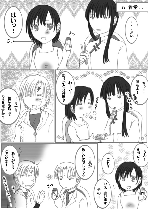 星野様SQ引越し完了まで寂しい皆さんへの救済漫画です 熟年夫婦ではなく、幼馴染ですよ、幼馴染!(笑) ニコさんが熱く『幼馴染萌え』を説き、台詞まで作ってくれたものですから、漫画にしてみました!>リンク君を絡ませたのは私(笑) アレン君も仲のいい幼馴染に嫉妬していますが、リナリーもリンク君に出遅れたことで悔しがっていればいい(笑) ↑ってことまで入ってたんですが、漫画に入りきれなかったのですよー。 後の部分は皆さんの心の目で見てください |