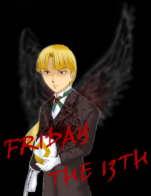 | 2009年は13日の金曜日当たり年なんですって! 去年は1回しかなかったので、今年は色々楽しめそうですね♪ そして第一弾は、もう私の暑い愛を受けてやまないリンク君ですよ(笑) えぇ、闇に溶ける翼辺りに私の偏執的な愛が見えませんか! 見えませんかそうですか。>非常にどうでもよさげに言うのやめなさい。 当初はあおり気味で、『お前なんか斬ってやる』ポーズを決めていたんですが、『せっかく鴉なんだもん、翼は必要だよね』と、俯き加減にポーズを変え、『じゃあ何か見つめている風に』と、鴉の仮面を持たせて・・・『だったら見つめてるのは、足元に倒れた死体とかよくね?!』と、血糊プラス(笑) えぇ、彼の足元には死体が転がってる設定ですよ!(笑) わがままラビとか生意気アレン君とかの(笑)>殺すな。ってか、殺しても死なねェ。 |