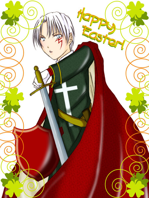 | HappyEaster!ってことで、クローバーの騎士です(笑)>なんだそれ!! なんかずいぶん前の映画で、『チューリップの騎士』と言うのがいた気もするので、クローバーくらいいいんじゃないかな! アレン君の構図に対してレイアウトをふざけすぎたかな、とは思いましたが、SSがあんなカンジなんでいいだろ、と、自分を納得させました。 盾に紋章が入ってないのは、どんな紋章にするか迷った挙句、『身分隠してんだから描かない方がいいのか』と思い直した次第。 紋章は普通、黒で塗りつぶして『現在フリー(日本で言う浪人)』をアピールするそうです。 黒騎士ってつまり、浪人だそうですよ。 |