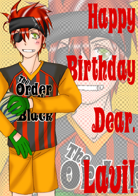 2012年ラビお誕生日TOPです! なんでキーパーのユニフォームかというのはSSをどうぞ! 本当はパンツにも番号振っておかなきゃなんでしょうが、まぁいいかってそのまま(笑)← チーム名は『黒の教団』ですよ!>まんまやん!(笑) ラビをキーパーにしたおかげで公平な試合ができました(^^)