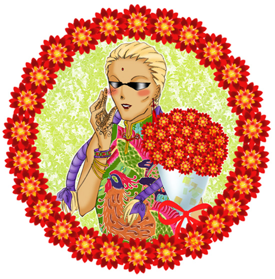 ジェリー姐さんお誕生会のフリー画像です。 姐さんはカラーが未出ですので、とんでもないハズレ引いた気がしないでもないのですが・・・まぁ、黒髪が緑だったり紫だったりする星野ワールドで、細かいことは気にすんな!(哄笑) 銀灰色のお目めだって、スカイブルーだったり赤だったり、緑だったりするんですから、簡単に染められる髪が何色だっていいんだよ!な!>黙れ 姐さんはおしゃれさんなので、ちゃんと自分の肌色に合った口紅をチョイスすると思います。(ブラウン系やエンジ系で) 手にしているのは、インド女性のおしゃれ、メヘンディ♪ 刺青ではなく、ヘナで縁起のいい模様を描くそうです。 が、腕輪は既婚者の印なんですって・・・!イヤン;;知らなかった;;; そして姐さんの服、鶏じゃなくて、鳳凰なんです・・・。 中国で買った、切り絵の柄から拝借しました。 花は誕生花のマリーゴールド。 花言葉は、『可憐な愛情』!!あぁ!!姐さんにふさわしい!! 他にも、『ムベ:愛嬌』とか、さすがだ、姐さん! 狙ったとしか思えない!(笑) |