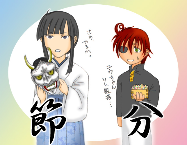 ただ、節分だったら袴だよなぁと、何気なく描き、色を塗る際になって、『いっつも真っ黒けだから、たまには明るく』と、青で塗ったのが運の尽き★