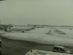 凍結を防ぐための処理だと、まずは作業場に行って、なにをするのかと思ったら、奇妙なクレーン車っぽい車が寄ってきて、飛行機の上からオレンジと緑の薬液をシャワーしてくれましたよ!