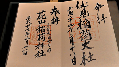 御朱印帳は今年できた新しいもの。 地紋の鶴が、刀にも写ってきれいなのです! お守りの太刀もいただいてきました! ・・・社務所は、奉納された数々の鶴丸グッズですごいことになっている; グッズって、こんなにあったんだなぁって思った(笑) 刀ステの、染谷鶴丸缶バッジもあったよ(笑) 社務所の隣には宝物殿があって、こちらも見てきました。 鶴丸は御物なのでここに本体はないんですが、三条宗近の太刀は奉納されていましたよ! 三日月は、なかご近くから反ってるんですけど、こっちは全体的にすんなり反っていて、とてもカッコよかった! 藤森神社の宝物殿、お勧めですよ! 続いて、我が家にも分社を祭っているおいなりさん、伏見稲荷大社へ。 三年連続で外国人観光客人気ナンバーワンだそうで、もっと大きな駅なのかと思ったら、かなり小さな駅なんですね。 ・・・お宮とJRは別ですね、世知辛い・・・。← 入口の狐がかわいいのです! ![]() そして、さすがの堂々たるお宮! ![]() 早速お参りして、御朱印とお札いただきました! 宮司さん達、にこやかでおもてなし上手でした そのまま上がって千本鳥居に行ったんですが、あまりの人の多さに断念。 後で来よう、ってことにして、一旦出ますよ。 それにしても、京都を歩いているとよく、着物を着た子に会うんですが、レンタルだな、って一目でわかりますね。 初めて見た時、『浴衣?!』って思った。 洗えるナイロン地か何かで、たぶん2000円くらいのお品。 帯も一応、織の物ではあるけど、1500円くらいだろうな。 せっかくだから、もっと質のいいもの着せてあげればいいのに。 洗える着物でも、安っぽく見えないものはたくさんあるのにな。 ともあれ、一旦京都駅に戻って、山科駅へ! 私のメイン、花山稲荷神社へ行きますよ!! バスがなかったし、道がわかんないので、素直にタクシー使いました(笑) 『近場だったら申し訳ないんですが』ってお願いしたんですけど、これは・・・タクシー使って正解!! わかんない! 絶対、道わかんない!! でも、ちゃんと参道まで連れて行ってもらって、ようやく来たよ、小狐 ![]() ![]() お宮の前にいるうちの狐、やっぱり一番可愛い ・・・うちの狐以外、全部消えてしまって、うちの狐一人だけになればいいのに、って言ったら、かいんさんに『暴動が起きるからやめろ』言われました・・・。 うちの狐だけでいいのに・・・! 一緒に写真撮ってきましたが、すごい身長差です(笑) 大きいけれど小狐丸・・・。 御朱印もいただきました! ![]() ずいぶん並んでたので、時間かかってしまった。 けど・・・なんだか宮司さんには申し訳ない気持ちです・・・; それに、鶴丸ほどではないけど、ここにも小狐丸グッズがたくさん(笑) アホが押し寄せてすみません・・・; 代わりに、お狐さんお守り頂いて帰ります! 『一番のカワイ子ちゃんね(笑)』って渡して頂きました(笑) 本当は太刀守りも欲しかったけど、当然のように売り切れでした。 稲荷塚も、奥さんに場所を教えてもらって、ようやく発見!! ![]() ここで作られたんだね、小狐・・・! 毎年、こちらで小狐丸鍛刀のお火焚き祭があるそうで、紙芝居にもなってましたよ(笑) さすが、京都の子供は『公家』とか『命婦』とか、普通に知ってるんだな・・・。 名残惜しいけれど、これでお別れだよ、って、小狐に見送られて神社出ました。 通りすがりの女性にバス停の場所を教えてもらって、山科駅に戻れました。 駅に着いたら雨が降り出したけど、傘を差すほどではない程度。 雨だって言ってたのに、よく持ったな。 まぁ、私がハイテンションだったせいもあるでしょうが、坂も階段も歩き回ったおかげで、めっちゃ足が痛い・・・! そりゃ・・・12時前に着いてから、4時間くらい歩きっぱなしですもんね。 さすがに疲れたので、京都駅に戻ってからお茶しようとしたんですが、どこもいっぱいだよ! 都路里でお茶したかったのに、すごい並んでるよ!! 一瞬で心折れたので、別のお店でお茶してきました。 看板に『クグロフ』ってあって、『クグロフってウィーンで食べて以来だねー』なんて、どこのセレブだ、って会話する私達(笑) いや、ここで食べたのは普通のケーキセットでしたけどw お店を出たら、そろそろお宿には行かなきゃ、って、荷物持って迷いながらなんとか着。 外国人客も多い宿らしく、受付は西洋人男性でした。 『朝食の予約はせんじつお願いしますね』って言われて、『先日??え??チェックイン時に、って言われましたけど??』って言ったら、『発音悪くてごめんなさい、前日です;;』って(笑) やだ可愛いwww 同音異義語が多いんだよな、日本語・・・。 荷物置いたら、京都駅に戻って夕飯ですよ。 京都のグルメ調べてた時から、行ってみたいなーと思っていたお茶漬けのお店がそこまで混んでなかったので、大盛でハーフハーフいただいてきました! 美味しかった(・▽・) 鶴丸の御朱印帳にカバーがなかったので、ダイソーでビニールのカバーと、その下のドンキで足