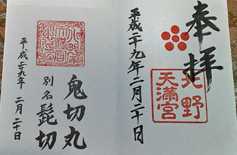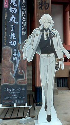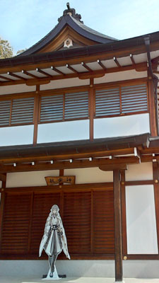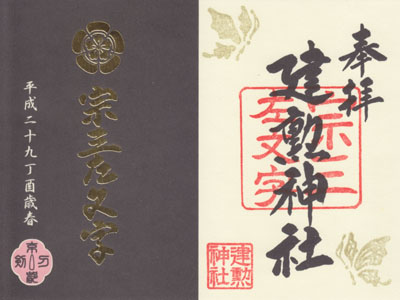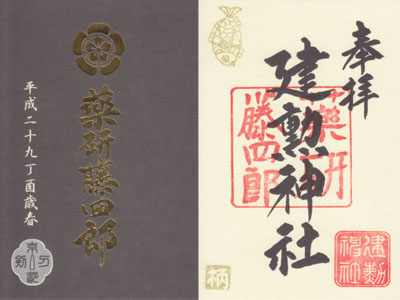 お参りして、御朱印を頂きに行ったら、兄者の押し型の御朱印発見!! ![]() もちろん、頂いて来ましたよ! 宝物殿では、入った所に兄者の本体がどーんと! ![]() やあ兄者、はじめまして(^▽^)ノ 私が刑部姫ですよ(・▽・)♪← 兄者の後ろに小鬼の像があって、なんだか兄者応援団な感じ(笑)かわいい(笑) 宝物殿の中には、兄者の他にも素敵な刀がたくさん(*´▽`) やっぱり足を止めるのは長船ですよね! 本当にスタイリッシュ&ビューティフル(*´▽`) 最高かよ! 中には、『ちゃんと研いであげて―;;;せっかくの長船−;;;』ってのもあったけど、さすが北野天満宮。 素晴らしい品ぞろえでした。 でも一番すごかったのは、どう見ても肉切り包丁だろうって感じの脇差・・・。 ![]() なんでこんな風に作ろうと思ったんだ? 刀工にこの時の気持ちを聞いてみたいと思った。 満足するまできゃっきゃしてたらずいぶん時間食ってましたね! 待ち時間が凄いんじゃないかと覚悟してたのに、見てる時間が凄まじかったね! 北野天満宮の入口に、『誘惑に負けず、強い心で』って書いていたんですが、あっさり負けました!弱い!! 北野天満宮を出たら、バスで北野白梅町まで行って、またバスで建勲神社へ。 鳥居までは、HPに写真で道順を教えてくれているのであっさり到着。