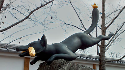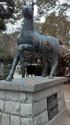 HPの雰囲気的に、もっとこぢんまりしてると思ってた。 広い駐車場もあるし、元々競馬関係での参拝者が多かったみたいですね。 まずはご参拝、と、馬の像の脇にある御手水を使ってお参りしたら、神楽殿前に白い太刀がいました(笑) ![]() よっ!今日は驚きの暑さだな! 急な坂を下ってきたこともあるかもしれないけど、本当に暑かった! コート脱いで行ったよ;; 御朱印もいただきましたよ!