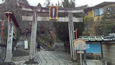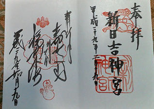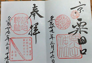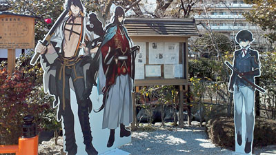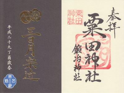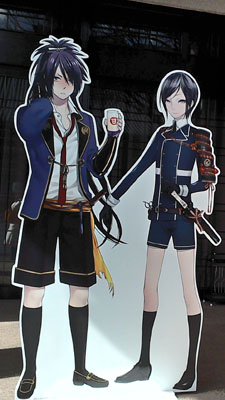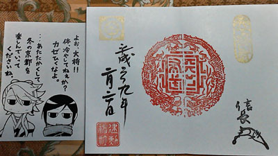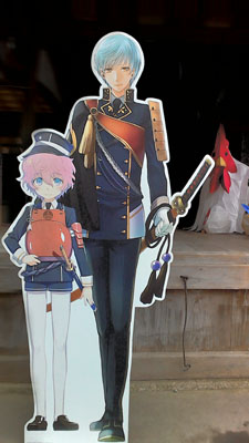 すまん、迷った(笑) この子、私と身長同じくらいなんですが、細さに愕然とするな(笑) そしてやっぱり、パネルの隣や社務所にはフィギュアやグッズがたくさん(笑) 骨喰だけに、鯰尾のグッズもたくさんありました(笑) そう言えば、豊国神社と徳川美術館がコラボして、骨喰と鯰尾の本体同士が展示された企画もありましたね(笑) 基本的にはノリがいいんだな、ここも(笑) 手前には、なんだかとても手馴れた感じのおみくじガイド(骨喰&鯰尾イラスト)もあって、審神者の財布に真剣必殺です。 通常の御朱印もいただきましたが、特別御朱印もあります。 ・・・ここで、特別御朱印の存在を知る二人。 『藤森で買わなかったな。一番大事なのに』『帰りに行くか』ってことで意見一致。 豊国を出たら、兄弟のメイン、粟田神社ですよ! ![]() 今日は京都マラソンが開催されて、バスが交通規制されると聞いていたので、電車をメインで使っていきます。 途中、これでもかと存在を主張する平安神宮をスルー。 鮮やかに。そして軽やかに。 てくてくと歩いて粟田神社到着・・・坂道と階段、すげーなー・・・・・・。 昨日で使い切ったはずの足に鞭打って登りましたよ、もう足元しか見えない! いち兄と秋田が神楽殿の前に並んでいるのを見ながら、まずはお参りです。 ここ、御手水が自動なんですよ(笑) 人が近づくと、竜の口からお水が出ます。 なんかハイテク(笑) お参りした後、いち兄&秋田撮影会。 ![]() 神楽殿にある、イケ鶏が目線寄越してくる(笑) 粟田神社と鍛冶神社の御朱印の他、特別御朱印もいただいて、つらい階段を降りたらすぐの所にある鍛冶神社にお参り。