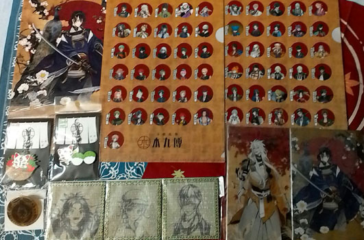 ・・・これだけ見たら、ちょっとホラーだな。>そういうこと言うな。 撮影禁止の祝画は、多分2周年記念画集じゃないかな。 大倶利伽羅と長谷部くんがめっちゃかっこよかった。 そんで、敵を挑発している貞ちゃんがめっちゃ男前だった(笑) 小狐と三日月がなくて、ちょい残念でしたが・・・。 まぁ、画集には載っているだろうと信じたい。 たろ兄もいないんだもん(´・ω・`) 物販では色々買ってしまった(笑)