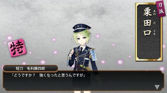 貞ちゃんはしっかりものだから大丈夫! 貞ちゃんに関しては信頼の強いみっちゃんです(笑) 貞ちゃんを旅に出したので、近侍をオカンからたろ兄に替えて、鍛刀ですよ! ネタバレサイトでレシピを見て、550/550/750/750でまずは富士札・・・江雪兄様。 うーん・・・もう一回。 ・・・・・・江雪兄様。 富士札、本当に仕事しないよな。 じゃあ松入れるか、って、資材はそのまま+松札。 ・・・・・・長曽祢。 君はもう、いらないんだ。 もう一回、松札・・・5時間きたあああああああああああああ!!!!!! ![]() いらっしゃい、巴!!!!! 二連続三池の時もそうだったけど、富士札より仕事早い松札! いや、もはや松兄!! 鉄腕DASHで最も頼りになる男!松兄!!>人間かよ。 たろ兄もありがとうございましたああああああ!!!!! もう、たろ兄に任せておけば間違いない! 信頼と実績のたろ兄!! 早速近侍にして、まずは演練。 ・・・まぁ、そうだとは思ってたけど、巴と極めた貞ちゃんですな。 あぁ、私の戦場はそんなもんさ。 戦力拡充も来ていたので、さくっと貞ちゃん捜索エリアまで終わらせて、特つけました。 ![]() お疲れ様、巴。 ご飯ですよー。