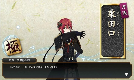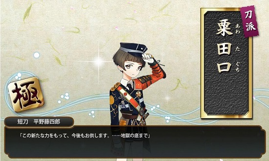 もう、ついでだから観とくかと(笑) 一緒に、長谷部国重の脇差も展示してあって、皆焼は本当にきれいだなぁ。 黒田展の方にあった長船がいまいち私好みじゃなかったし、城井兼光いなかったから、こっちで癒やされました(笑) 長居するつもりはなかったんだけど、うっかり5時ちかくまでいました(笑) まぁ、近所だからいいけど。 帰ってからは、開き直りの『新人極歓迎会in江戸城』催し中です。 あと7日で主のレベルを280にするため、新たに極めた子達が江戸城内突入させられています(笑) すごいなー。2コマ目で全員重傷だね でもだんだん、ボスマス近くまで行けるようになったよね! がんばー |