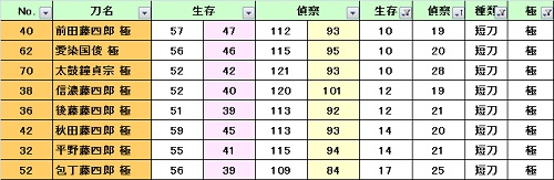 | 刀剣のデータ修正しました。 新刀増えたのに、全然触ってなかった; 極が増えて、管理が面倒になったので、刀帳番号をキーにvlookupで基本データを持ってきて、現在の生存、偵察を入力。 フィルタで並べかえて、効率よく内番管理するよ! ![]() 一番右の『極』項目は、刀名をright,1で持ってきているため、他のセルには『近』とか『丸』が入っているよwww 右側の『生存』『偵察』が伸びしろなので、まずは包丁と平野んを中心に内番ですね。 これ作ってて気づいたけど、1番と21番に入るだろう童子切と鬼丸の他に、パパ上の次の126番も埋まってなかったんだね。 誰が来るんだろう。 巴以降がカオスになっているから、この3つが埋まった時点で刀帳の整理してほしいなぁ。 そんなことしながら録画消化してましたよ。 軍師官兵衛(再放送)で、へし切長谷部ゲットしたぜー! けど!! この時代、まだ拵は金霰鮫青漆打刀拵じゃないでしょ! これは、安宅切の拵えをモデルに1800年台に作られたんだよ! 信長とっくに死んでるよ! 気をつけてほしいなぁ、もう! そんな本日のせるひは、リボンゲット記念小夜と、あぶくゲット記念兼さん。