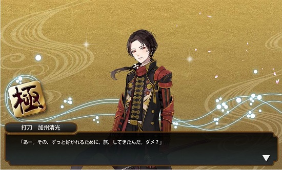 | 朝のうちはそうでもなかったんですが、昼過ぎてから急に風が激しくなって。 やだなぁ、早く帰りたいなぁと思っていたら、13時過ぎに総務から帰宅命令キター!ゞ(・▽・)ノ ママンに迎えに来てもらって、ついでに同じ方向の会社の人も送ってあげて、帰ってきましたお。 バスは動いていたんだけど、横殴りの雨でとんでもなかったから、迎えに来てもらってよかった。 今日は刀剣がメンテなので、昨日引き取ってきたつはものDVDを見ながら外を見ていたら、木が折れそうな暴風・・・。 地震かと思うくらい、家揺れる・・・。 久しぶりにすごい台風来たな! 福岡市内には最近、こんなにひどいの来なかったから、油断してたぜ・・・。 ともあれ、三日月に小狐がブチ切れて、沙汰キャラ同士が切り結ぶの良き・・・なんて見ていたら、やたらとスマホがついった着信のバイブ音を鳴らすので、なんじゃい、と思って見てみたら、今日のメンテが神メンテとその予告だったことが判明・・・! おおお・・・刀剣部屋が増えている・・・・・・! 150振所有できるようになっていたよ・・・! 来月末に習合と言う機能がつくらしく、以前から審神者がやってた『稀少刀、ただとかすのもったいないから本人に食わせる・・・』が、機能として実現する予定だそうですよ! この対策か、鍛刀できる子も増えた! とは言え、現在コンプしてるし、玉鋼12万ちょっとしかないので、鍛刀はALL50で日課消化するだけですけどね。 うん、そのうち本気出す。 しかし、何振りまで習合できるんだろう・・・。 さすがに際限なしじゃないだろうし。 ついったで、99振り習合して付喪(九十九)神、なんて言われてましたけど、さすがにそれはないだろうから、5振りくらいかなぁ・・・。 早く言ってくれたらいいのに、昨日、大包平が5振りくらい、加州のご飯になったよ・・・。 てっきり鍛刀勢に入ってると思ったにゃにゃ様が入ってなかったので、せっかくカンストまで育てたにゃにゃ様習合してしまうの悲しい・・・。 しかしめっちゃそわそわしますな! そしてとうとう明日は、刀ステですよ!! 今日、ものすごい暴風雨なのに、今週ずっと雨の予報なのに、明日だけ曇りとか、すごくね?(笑) 蛍狩り、ログイン日数以外は全部終わったし、14万集め終わったし、心置きなく推しに会ってきますよー! そんな今週は、短刀ちゃんたちシリーズです。