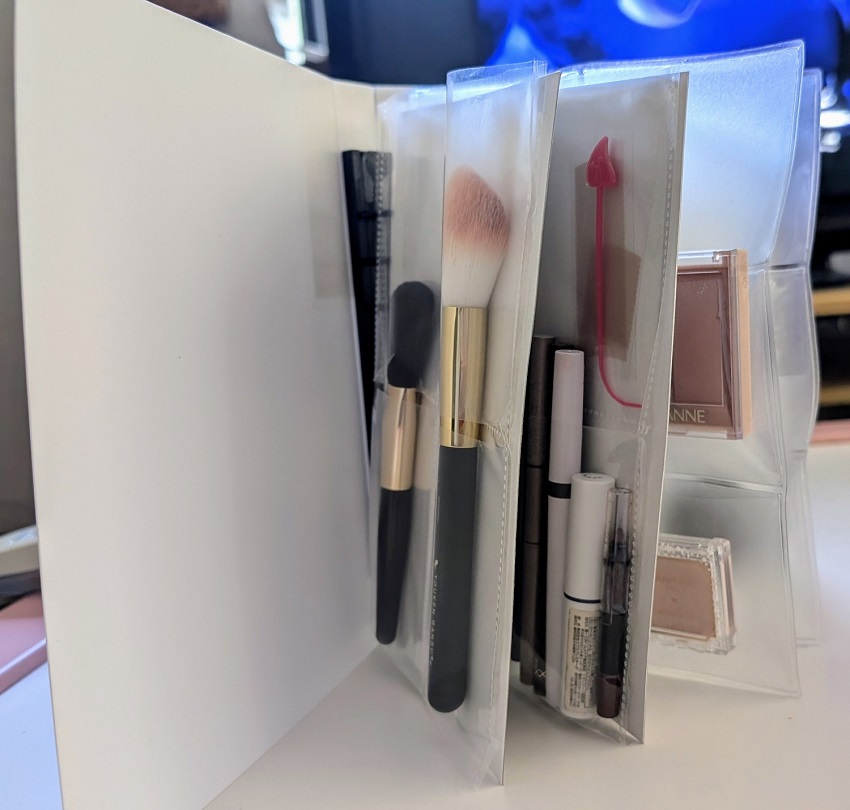 セリアの推し活コーナーにあるファイルとポケットリフィルをちょっと切って、ブラシとアイシャドウとチーク、ファンデを入れてる。