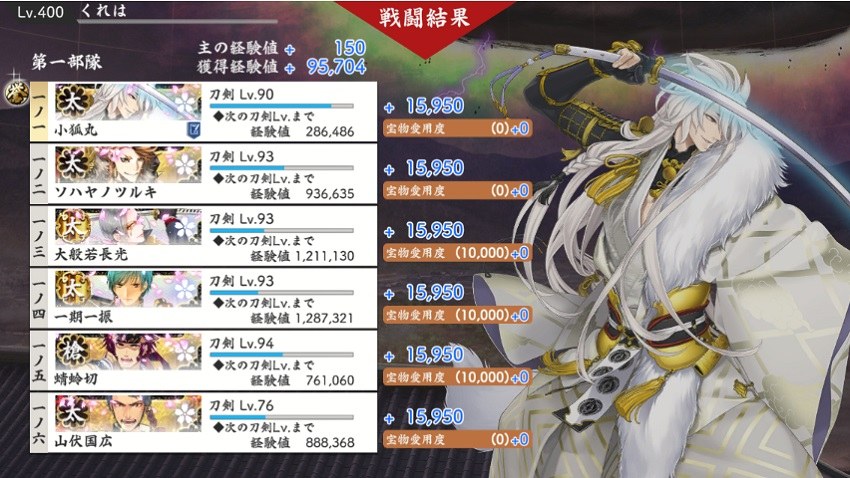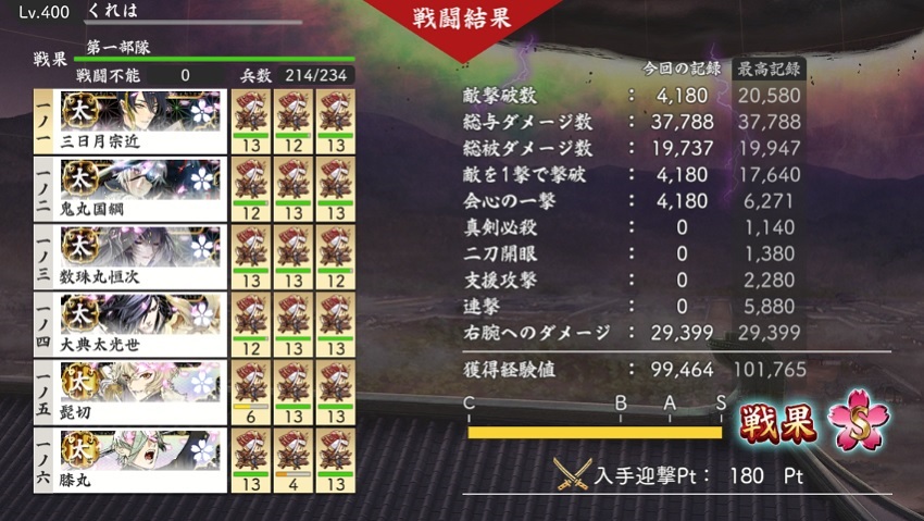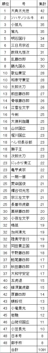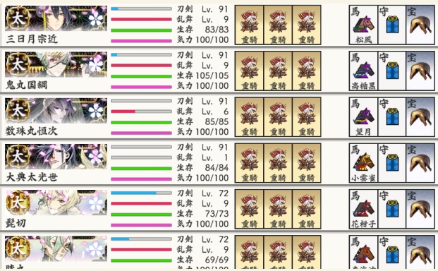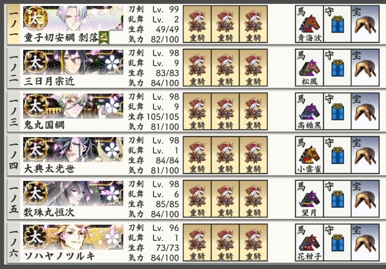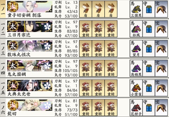 まだカンストしていない極は24振なんだけど、そのうち4振は小狐で2振りは同田貫なので、隊としては3つしか作れないという。
