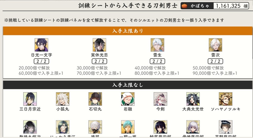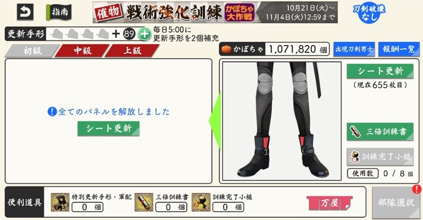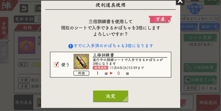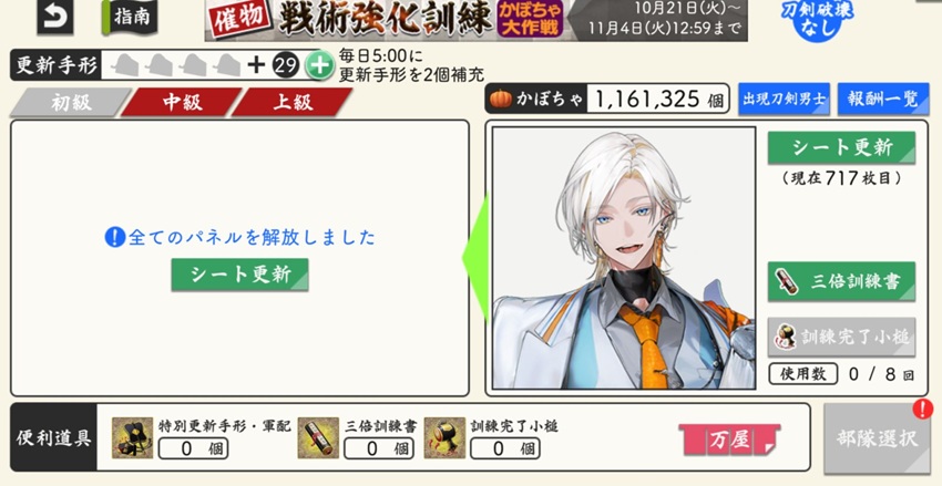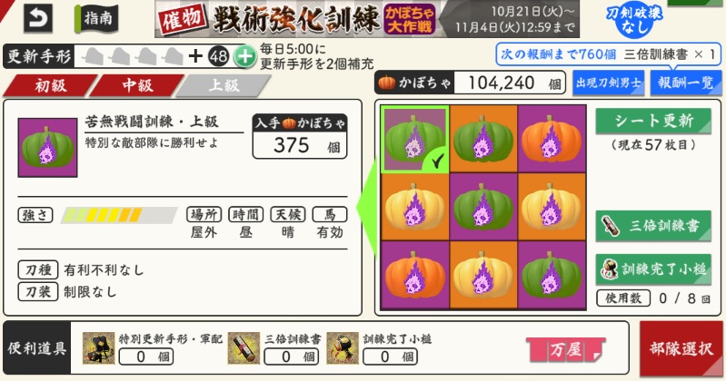 そんな本日のとうらぶさんは、かぼちゃのついでに宝物の愛用度あげようって、一萬目指してますよ。