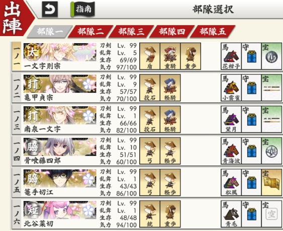 先生隊長とたーくんがLv49と52、むっちゃんと長谷部がLv99、桑名と松井がLv67と65で、レベルがバラバラなのがネックだなぁ。