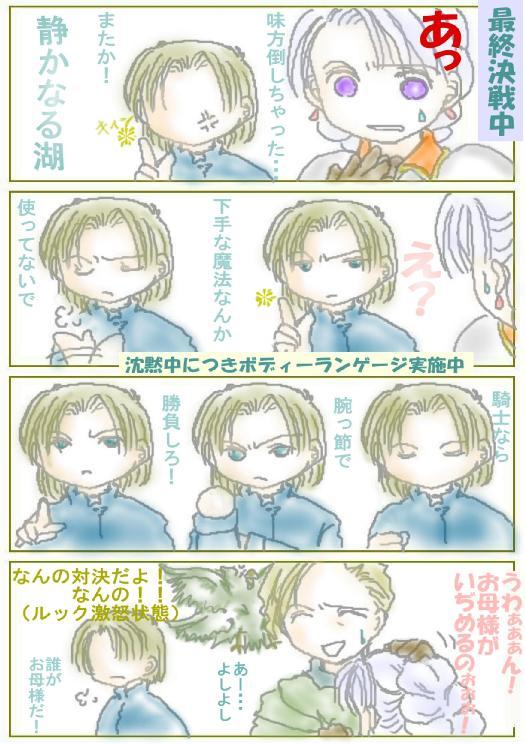 お題14『宿命の対決』でっすv 最終決戦の地で繰り広げられる、熾烈な嫁姑戦争・・・なんつって(笑) くれははナックリ派で、クリスとササライはナッシュを挟んで本妻と愛人、もしくは嫁姑の関係という設定です(笑) 構図も悪いけど、鳥ルックの資料がなかったので、かなり適当に・・・。ごめんちょ; しかも、これを描き上げるまでに4度も強制終了をくらいまして・・・。 これは涙と汗の結晶なんです(涙) 後で、原因はサイズを大きくしすぎていたせいだと判明――――;; 悪いのは、パソではなくくれはの頭でした; |