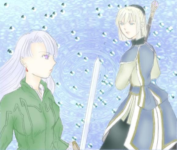 お題29『剣と盾と』ですv 普通、ここで2主とジョウイが出てくるはずなんですよね・・・;; 私も最初はそのつもりだったのですよ。 ってか、それ以外ないでしょう、って; しかし、先日、ふと『弱き人々の盾となる』(by.ゼクセン騎士団)というセリフを思い出しまして。 『クリスが真水を継いでいたら、セラと水の乙女対決だったわけかー。って、セラもルックの盾であり、剣だな』 と思いつき、この二人の対決図を思い描いてしまったのでした(笑) いや、なんか、この二人の対決って、迫力ですね(笑) |