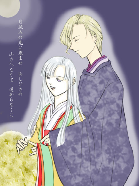 | お題30『月夜』ですv 『梨栗山秋の味覚祭り』開始日〜15日までの、限定TOP絵でございます。 『梨栗山』企画は、唐突に思いついた上に、9月9日が重陽の節句だと言うこともすっかり忘れていたため、平日だと言うのに真夜中までヒィヒィ言いながら描き続け、ようやく完成しました(^▽^;)>そこまでやったにも関わらず、アップできたのは10日の午前1時ごろでした;; ナッシュはともかく、クリスは『秋』と言うことで、『山吹の匂』の襲(かさね)と、『枯野』の襲を元に、他の色も入れたりして遊んでいます。(じゃあ、なんの襲になってるんだ、結局?!) 添えた短歌は万葉集で、 『月の光の中を来てください。山を隔てて遠くというわけではないのだから』 という、恋の歌v ・・・ハルモニアから険しい山道を越え、モンスターの跋扈する森や平原を抜けても、きっと『遠くはない』のですよ、二人には(笑) 直衣(のうし)と十二単なのは、前回のお題で源氏を書いた名残でございます(^^;) ちなみに重陽の節句とは、中国から日本に渡った風習で、前夜に菊の蕾の上に綿をのせ、菊の香りを含んだ露を染み込ませたそれで身体を拭って厄払いをしたという風習です。(枕草子か何かに書いていたような・・・) 菊酒を飲むもよし、歌を読むもよし・・・。 優雅な宮中行事ですわねぇ・・・v |